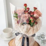 The Sweet Baby Bouquet features a refined selection of blooms, including the romantic Cappuccino Rose, known for its warm beige tones and symbolism of elegant affection and timeless love. We’ve also included the charming Chocolate Bubble Spray Roses, whose mocha-toned petals represent enduring sweetness and heartfelt emotion. Together with delicate carnations and soft eustomas, these flowers create a bouquet that feels intimate, thoughtful, and lasting.