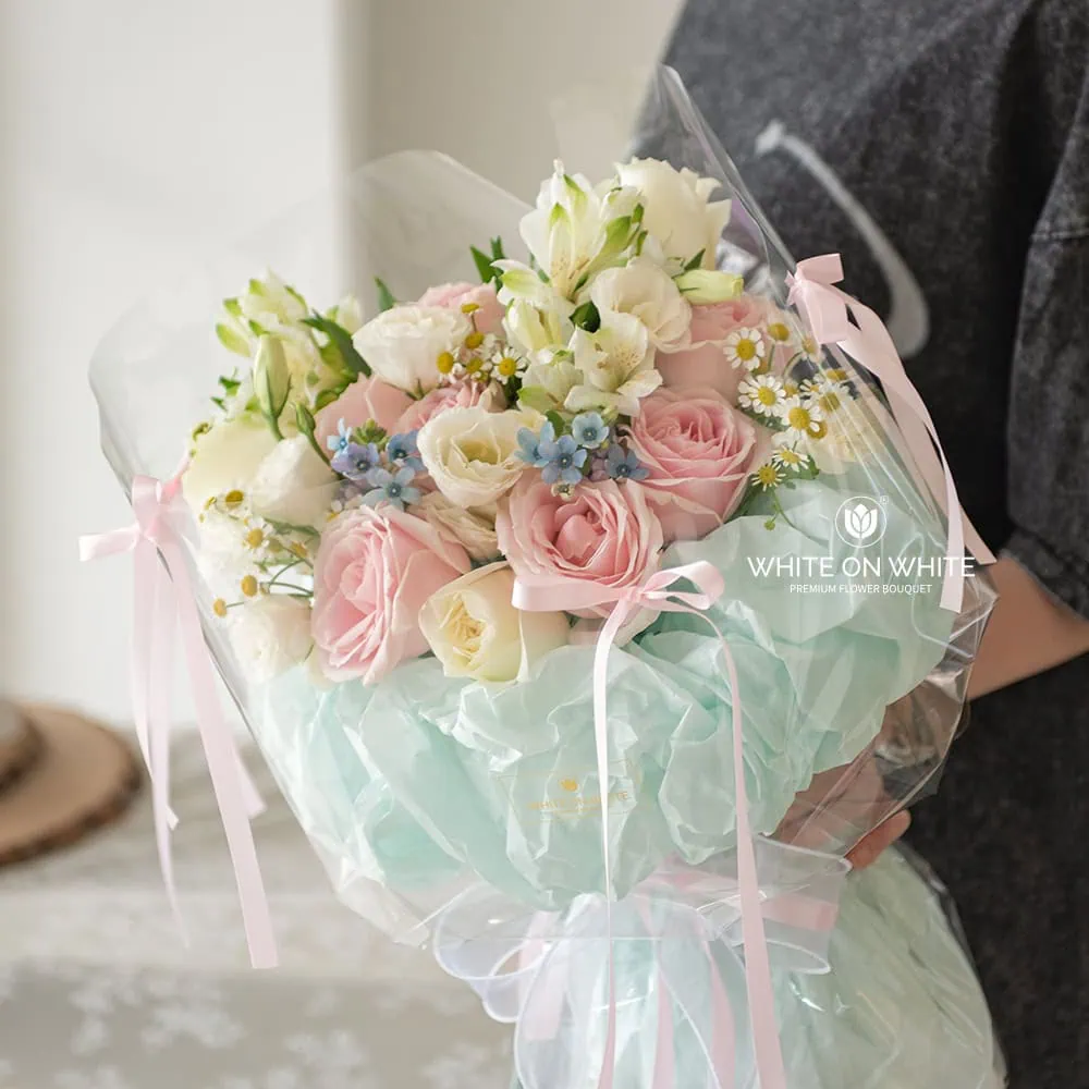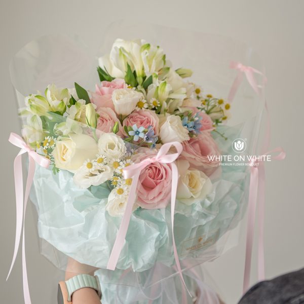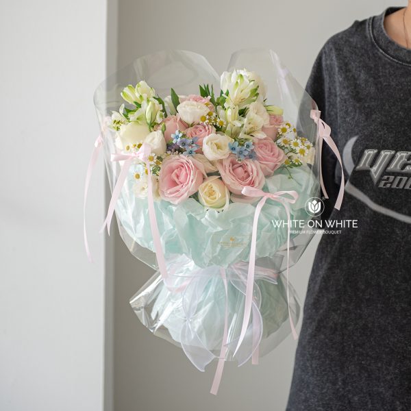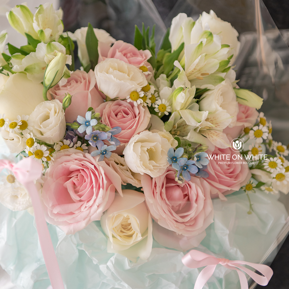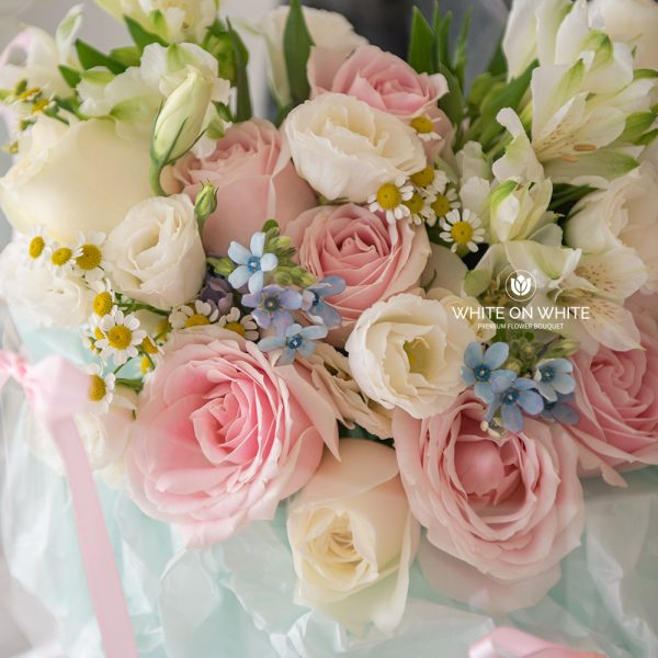 Pink Rose, White Rose, White Eustoma, White Alstroemeria, Chamomile, and Oxypetalum