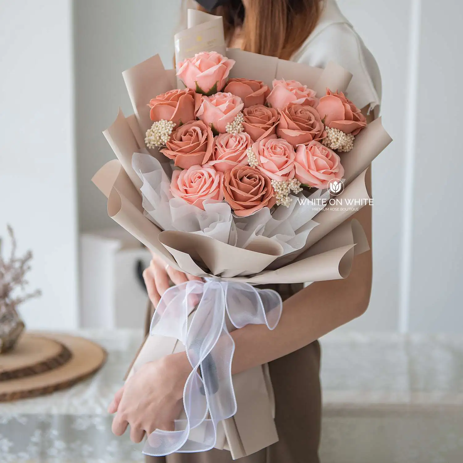 🌼 Allow the Sweet Serenity Bouquet to script your unique love story as you bask in the radiant glow of Chinese Valentine's Day- Qixi Festival 2023! This bouquet features 14 & 5 gentle soap roses in deep pink and soft pink shades!