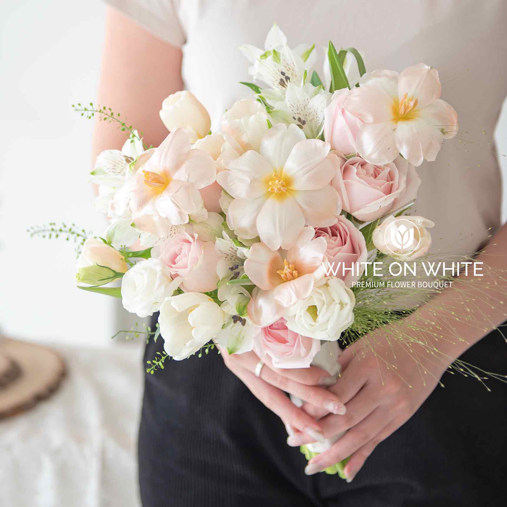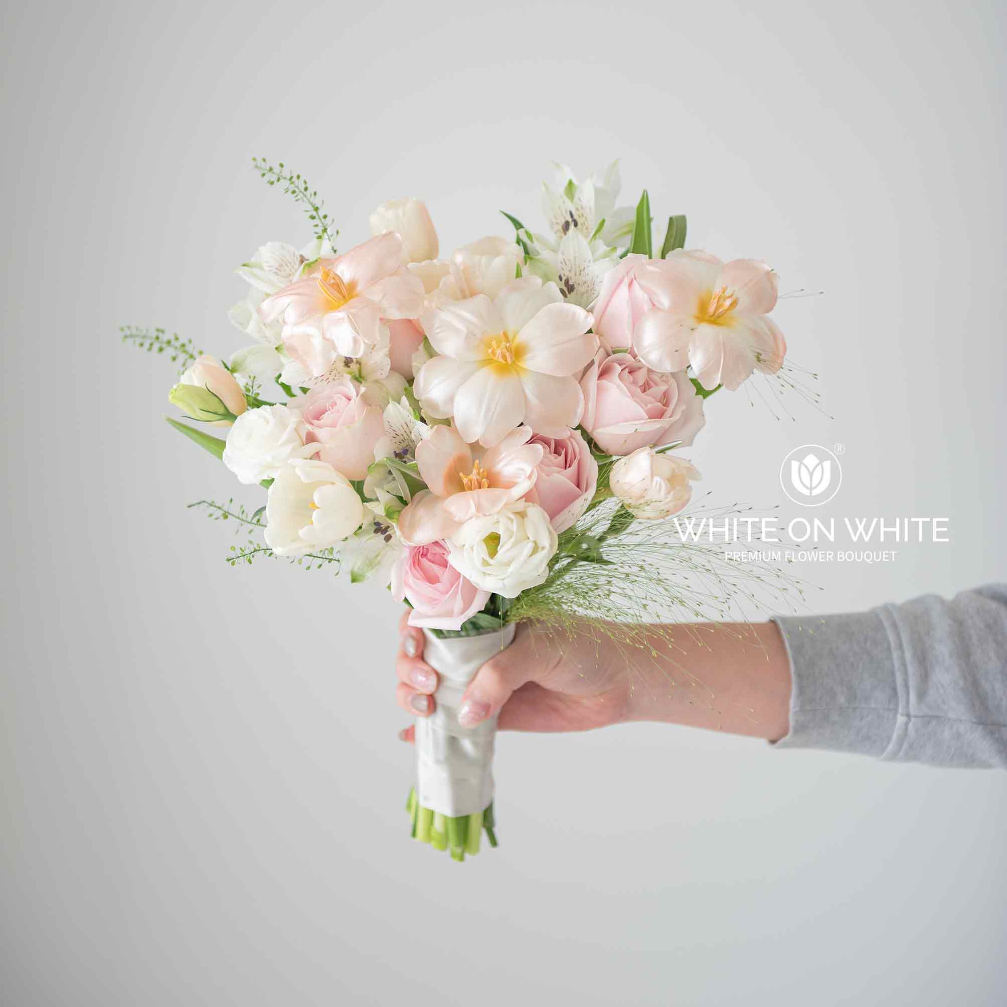 This bouquet, featuring a delicate mix of Pink Roses, White Alstroemeria, White Eustoma, White Tulips, and Panicum, perfectly complements the beauty of every bride. It’s more than just a bouquet; it symbolizes the fresh, new beginnings that a wedding represents.