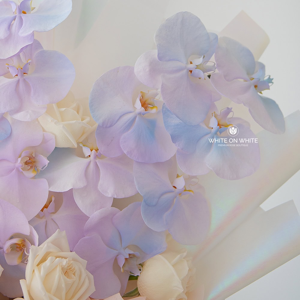 This bouquet is made up of Phalaenopsis orchids and White Roses, two flowers that together show off both strength and grace in their own way.