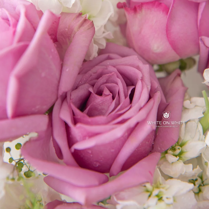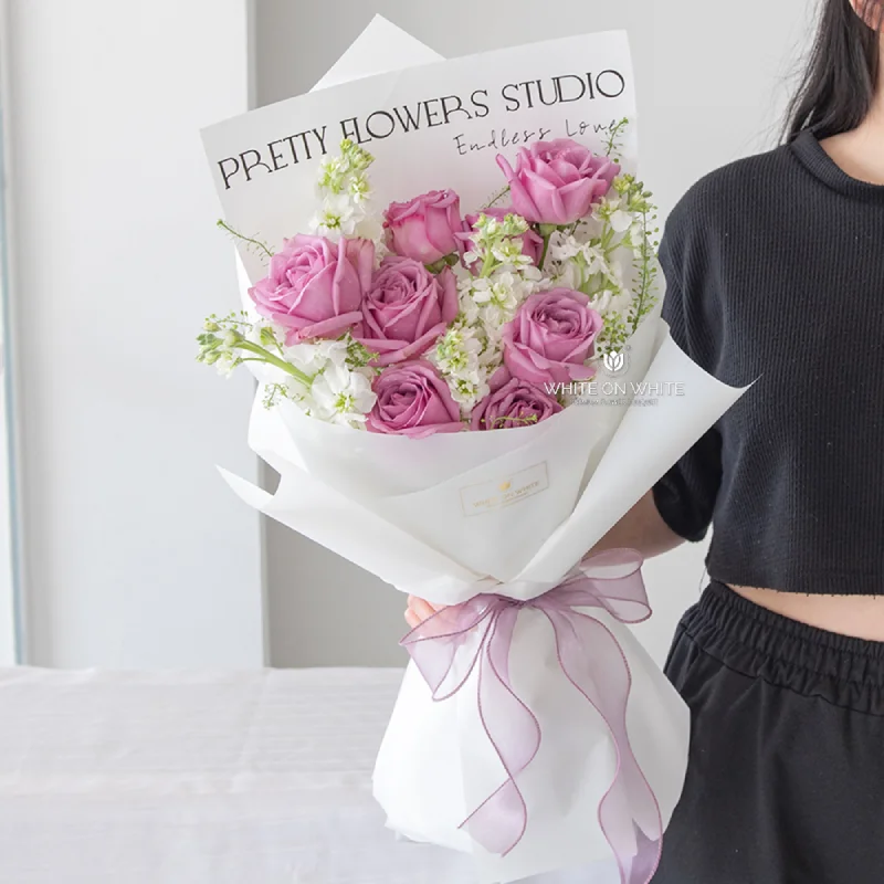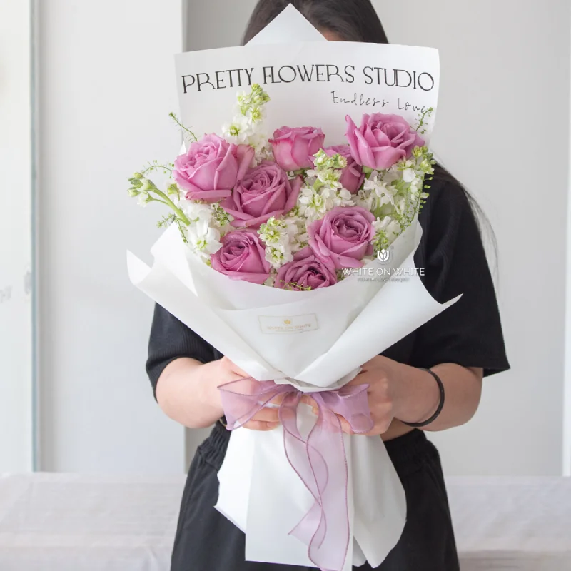 Designed with heart and intention, this bouquet brings together 8 stalks of Purple Rose, 5 stalks of White Matthiola, and refreshing Green Bell, each chosen for its meaning and energy.