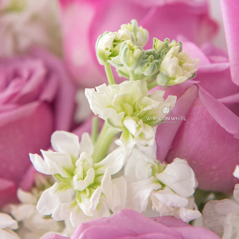 - White Matthiola brings purity and sincerity into the arrangement. The number 5 (五) symbolises 五福临门 – the five blessings of love, health, longevity, virtue, and peace, making it the perfect number to express deep, well-rounded affection.