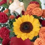 Red Rose, Sunflower, Red Carnations, Orange Rose Spray, Red Laceleaf, Champagne Roses