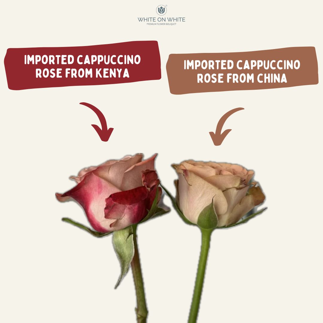 From the picture above, you can clearly see the minor variation on the outer layer whereby the imported cappuccino rose from Kenya has a slightly dark red shade while the imported cappuccino rose from the China has a typical dark coffee-coloured layer. Despite these minor variations, the overall appearance and color of the Cappuccino Rose remain largely consistent worldwide.