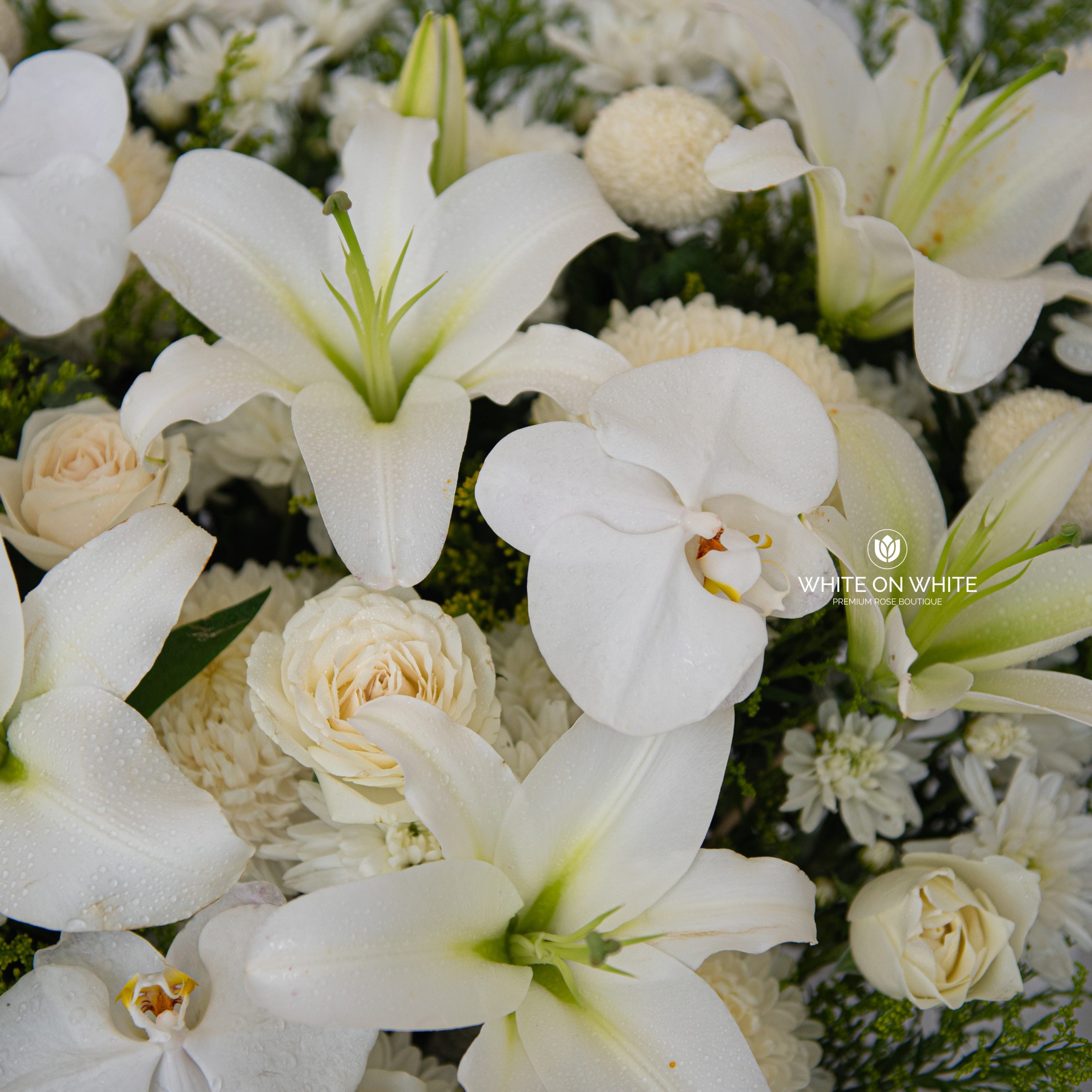 - The Phalaenopsis orchids exude an air of grace and elegance. It symbolize the everlasting beauty of cherished memories. White Lilies bring a sense of purity and peace, while White Roses gently whisper words of eternal love, offering a lasting tribute to the departed soul.