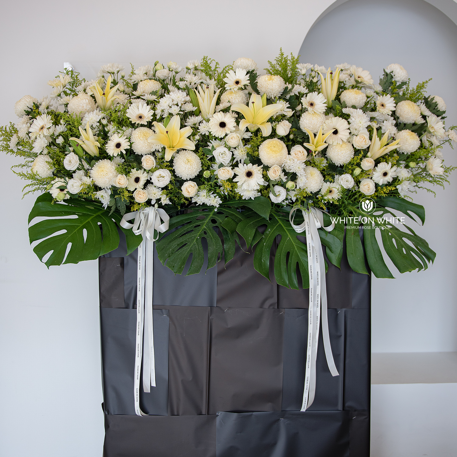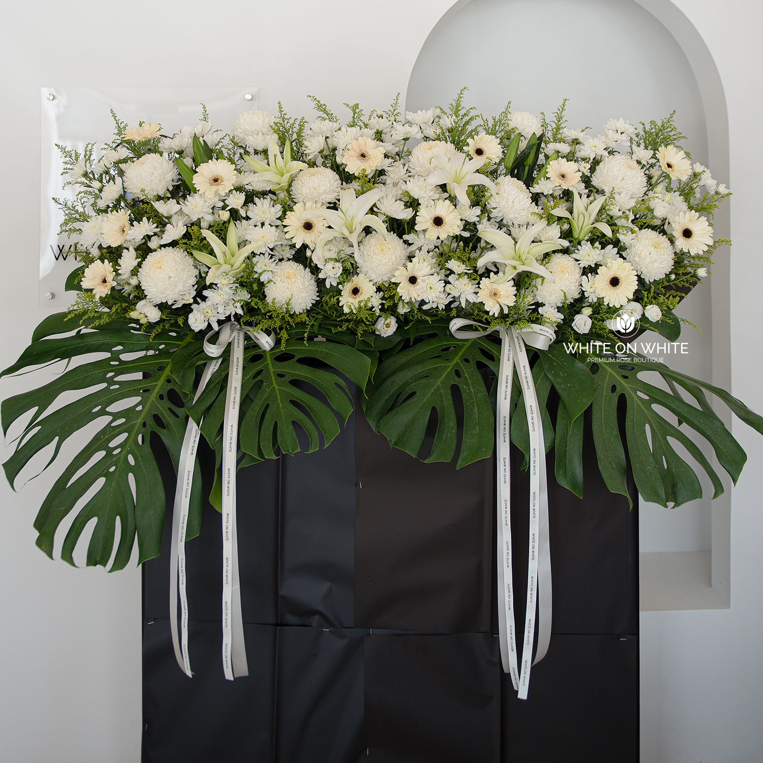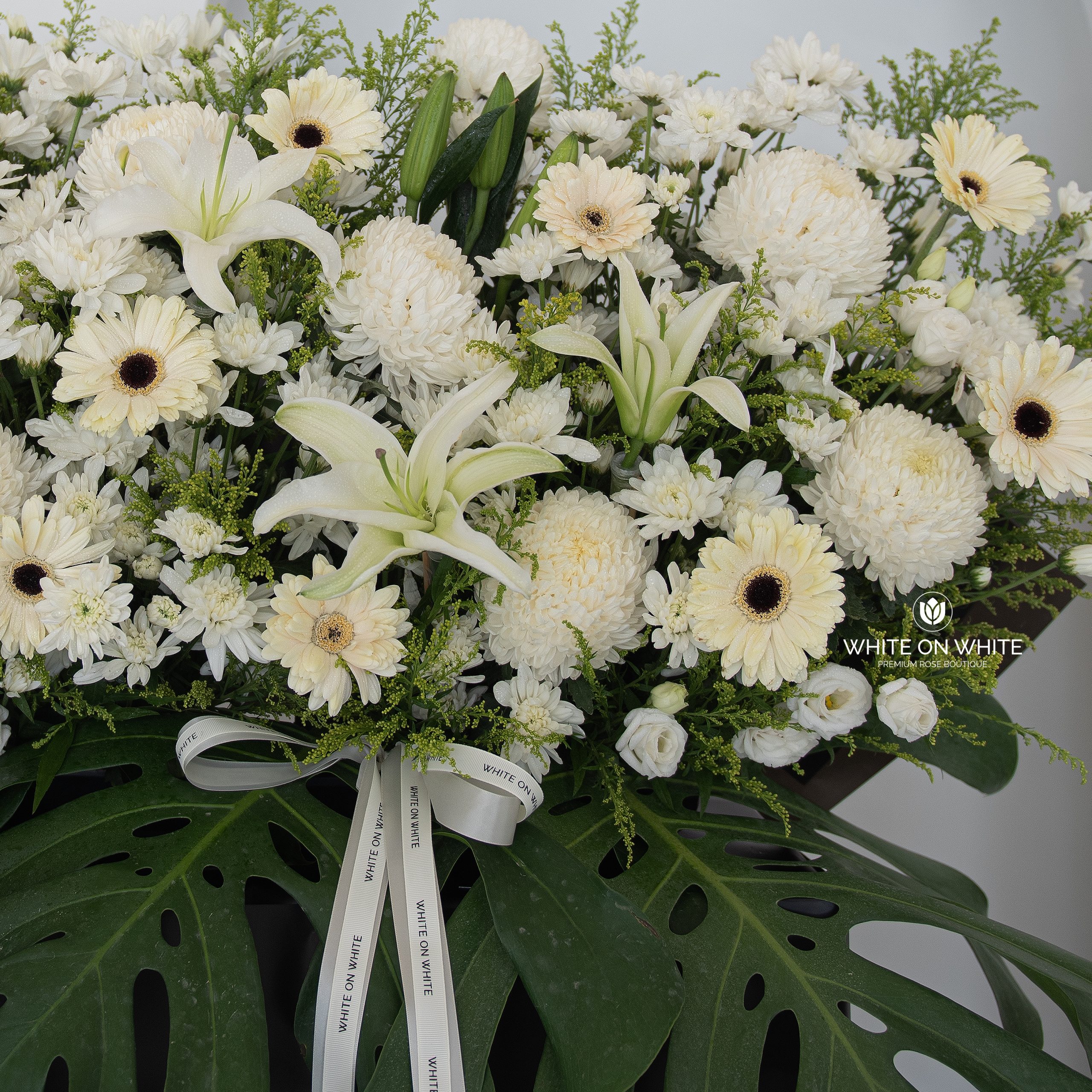 🌼 White Lily, White Roses, White Pompom, White Gerbera Daisy, White Eustoma, Chrysanthemum, Caspia and Monstera