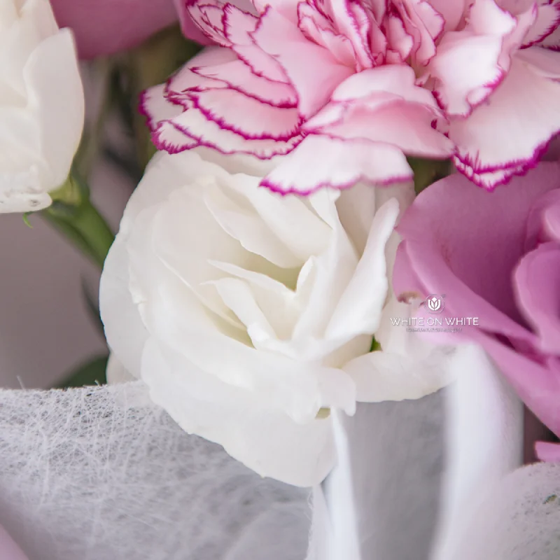 - To balance the vibrant purples, soft White Eustoma blooms add purity and elegance, creating harmony within the bouquet.