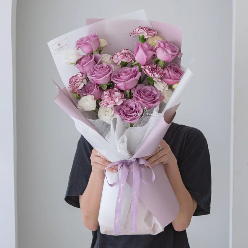 5 stalks of Purple Carnation, 10 stalks of Purple Rose, 1-2 stalks of White Eustoma