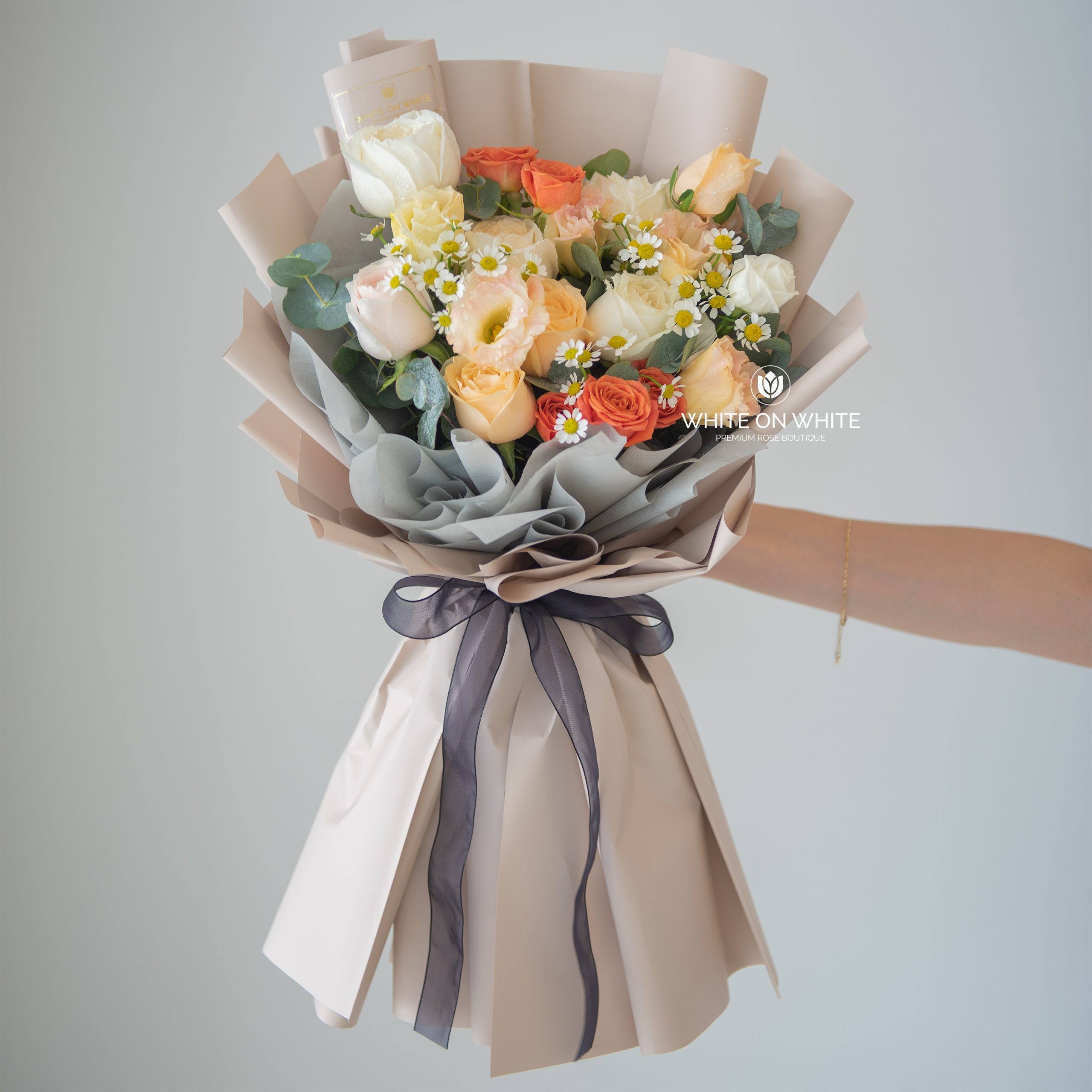 💐 • Champagne Rose + Orange Rose Spray + Pink Eustoma + White Rose + Chamomile and Cinerea