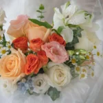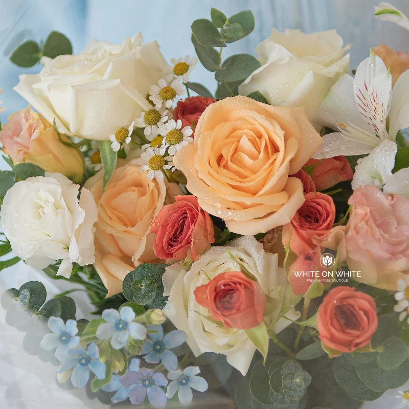 Champagne Rose, Orange Rose Spray, Pink Eustoma, Alstroemeria, Chamomile, Baby Blue and Oxypetalum